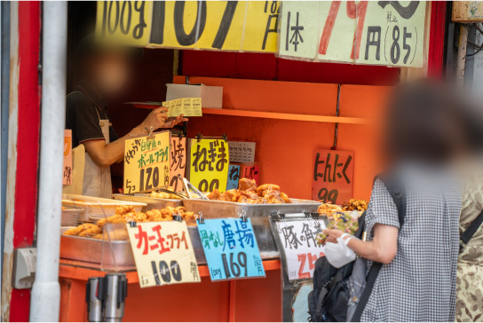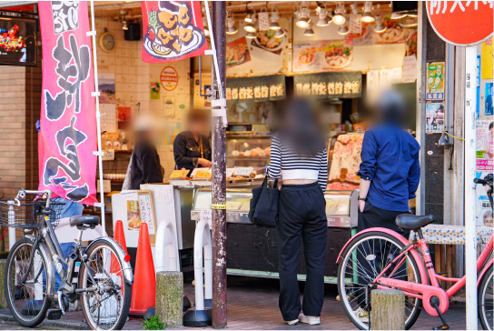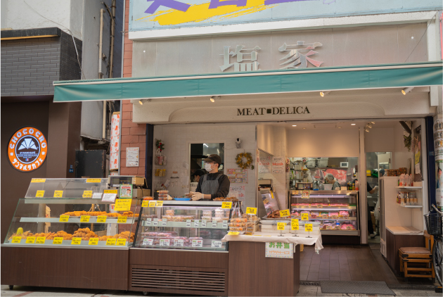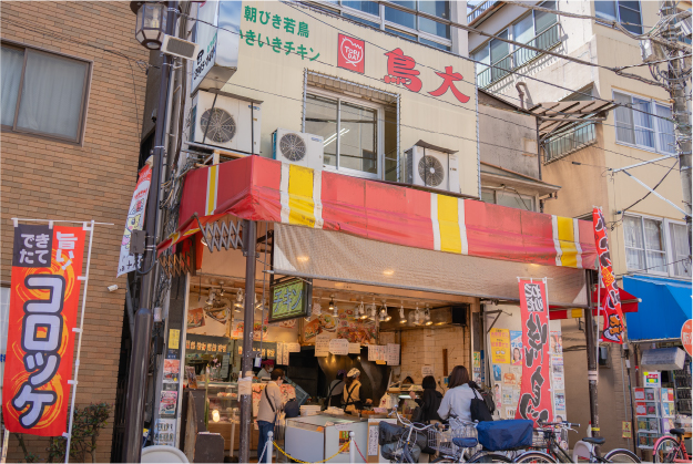 創業70年の老舗精肉店。ボリューム感のある揚げ物やお弁当などが充実しています。食べ歩きの名物、揚げたての「十条メンチ」も人気です。
