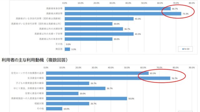 こちらの「リースバックの利用概況」の調査によると、リースバックを利用する主な世代は高齢の単身世帯または高齢の夫婦世帯となっています。