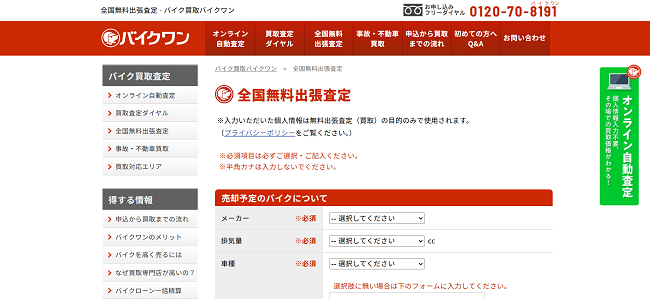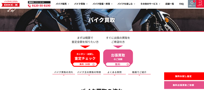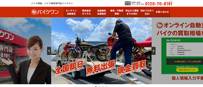 バイクワンは、全国無料出張査定を行っているバイク買取業者です。