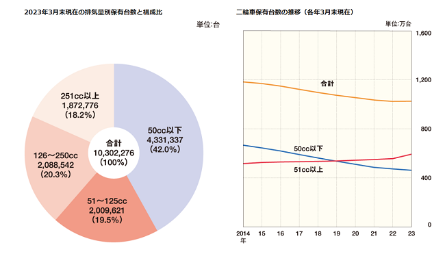 2023年3月末の日本国内における二輪車保有台数は1,030万2千台となり、排気量51cc以上の二輪車の保有数はやや増加傾向にあります。