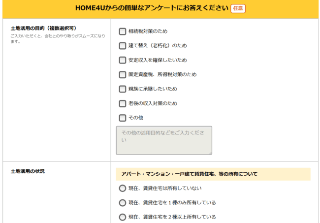 HOME4U土地活用では、申込フォームに土地活用の目的や現在の状況、要望などを記入して申し込むことが可能です。
