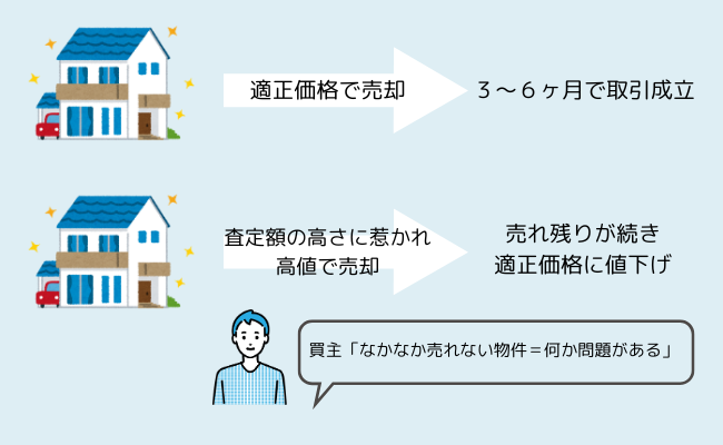 最終的に売れ残った場合はさらに大幅な値下げをすることになり、最初から適正価格で売り出した場合よりも低い価格で売却することになりかねません。