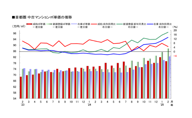 以下は、東日本不動産流通機構が2025年2月に発表している首都圏中古マンションの成約㎡単価と新規登録㎡単価の推移が分かるデータです。