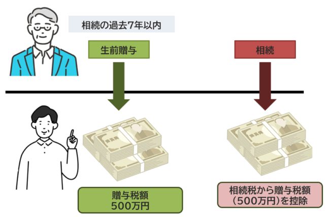 これを簡単に説明すると、例えば過去7年以内に財産Aを500万円で生前贈与された場合、相続時は財産Aも含めて相続税を計算し、そこに500万円を控除とするという仕組みです。
