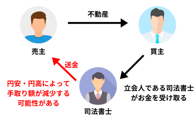 非居住者の不動産売却では、立ち会った司法書士等がお金を受け取り、その後売主本人の口座に送金されます。