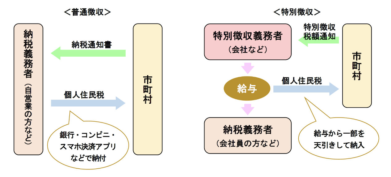 自分で納付する場合は普通徴収に、給与所得者であれば特別徴収に該当します。