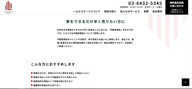 | おすすめの方 | ・不動産を短期間で売却したい方 ・築古ゆえ仲介売却を断られてしまった方 |