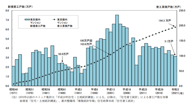 東京都のマンション市況は盛んで着工累積戸数は2021年時点で194.3万戸に上り、右肩上がりで増え続けています。