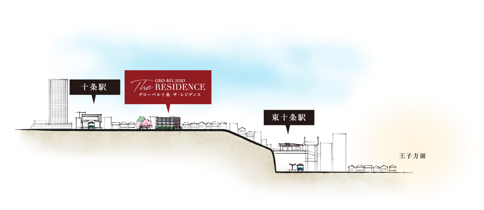 ①JR埼京線「十条」駅 、JR京浜東北線「東十条」駅 のJR2駅の中心に位置する高台の住宅地