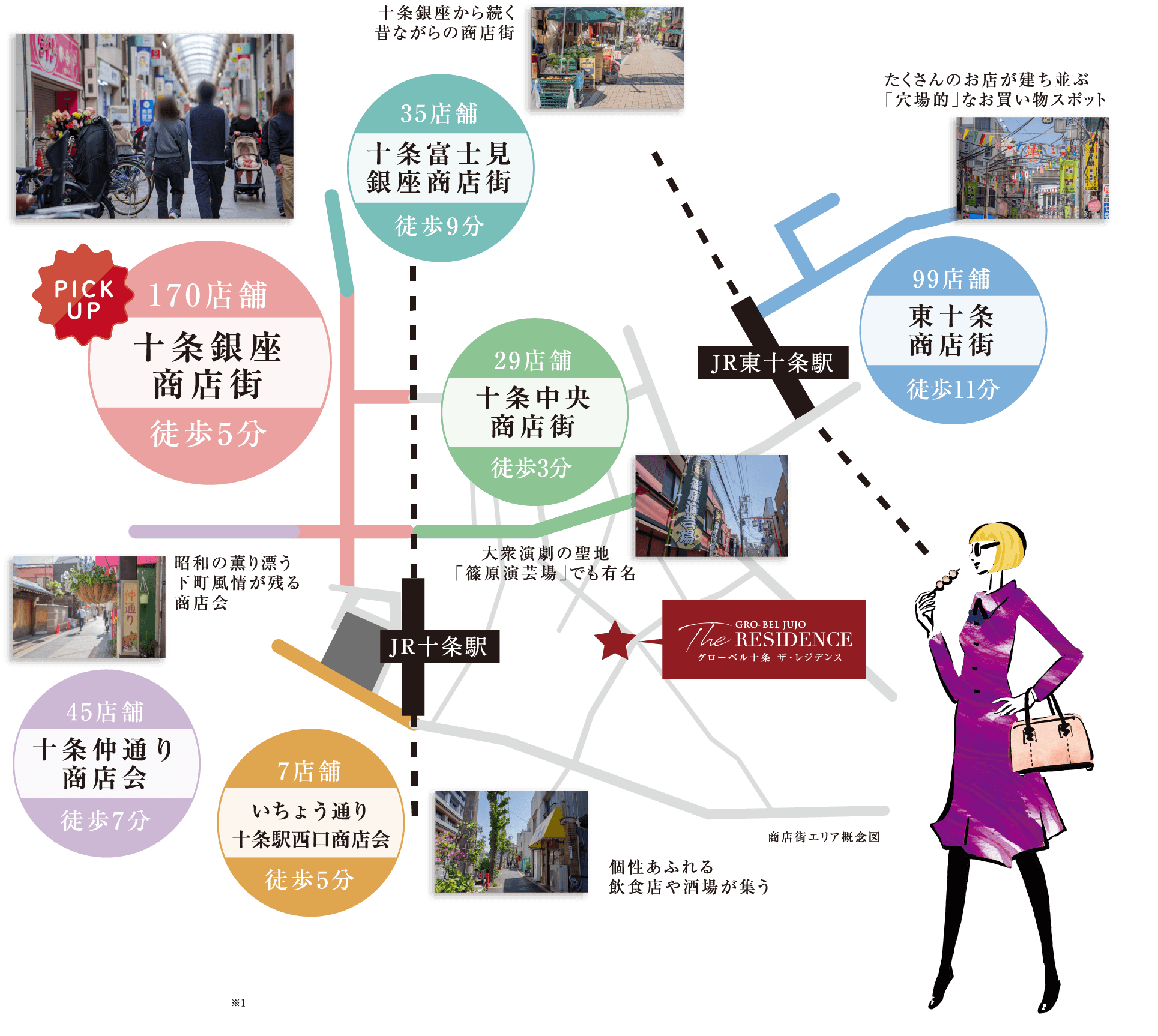 ○6つの商店街・約385店舗を普段使いできる便利で楽しさに満ちた立地。